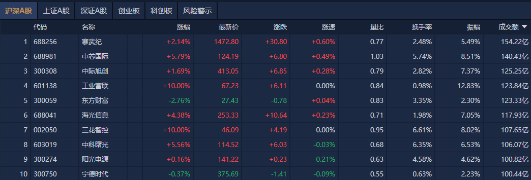 个股方面,寒武纪成交额超154亿元居首,中芯国际、中际旭创、工业富联成交额靠前。