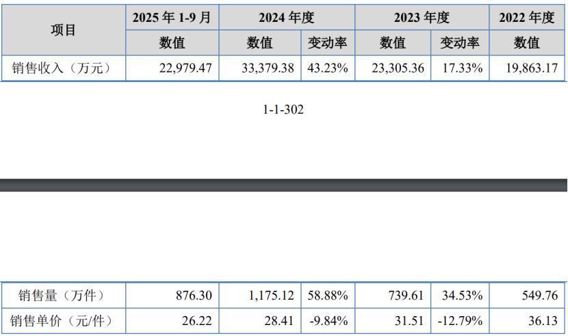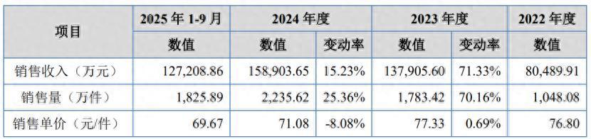 事实上,公司主要产品近年来呈下跌趋势。排气系统零部件产品是公司的核心收入来源,报告期内销售占比均在76%以上。排气系统零部件销售单价已从2022年的76.80元降至2025年前三季度的69.67元。
