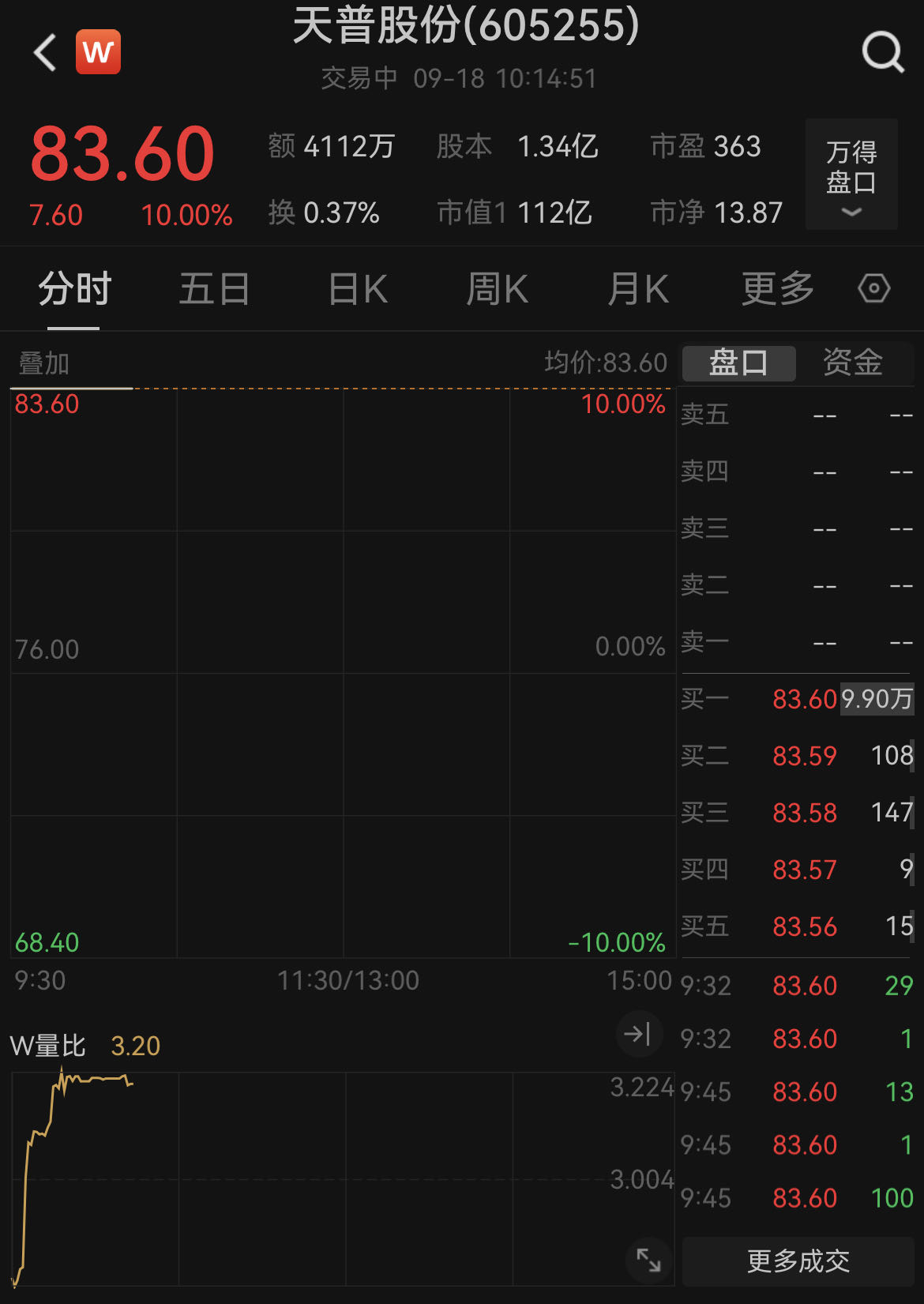 9月18日,停牌核查后复牌的天普股份(605255.SH)再度一字涨停,报83.6元/股,总市值达到112亿元。这是该股自8月22日以来的连续第12个涨停板,累计涨幅超过213%。